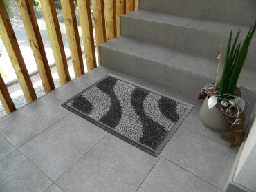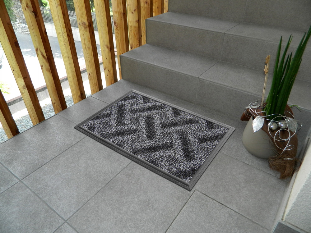 100% Polypropylen Heat Set. Dreidimensionale Optik mit intelligenter Hoch-Tief Struktur (sammelt den Schmutz in den Zwischenräumen) und einer hochwertigen thermofixierten synthetischen Faser (für die Schmutzaufnahme)